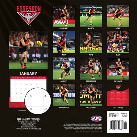 The offical AFL Essendon Bombers 2026 wall calendar, featuring all your favourite club players in action