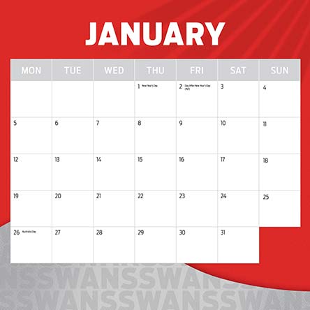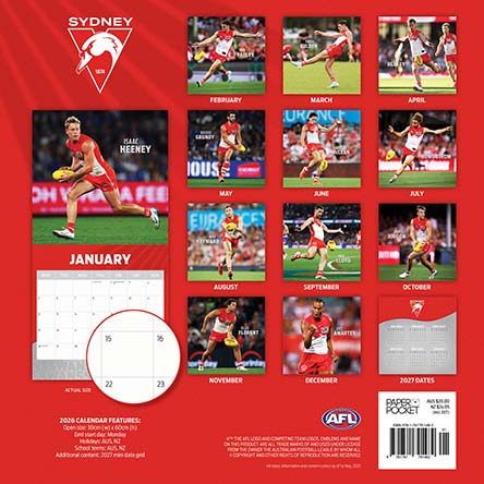 The offical AFL Sydney Swans 2026 calendar, featuring you favourite club players in action on the field.