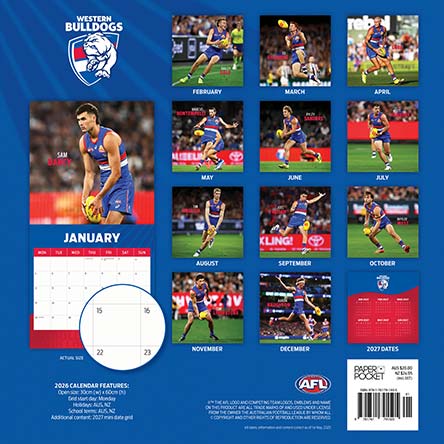 The offical AFL Western Bulldogs 2026 calendar, featuring you favourite club players in action on the field.
