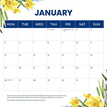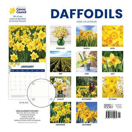 This calendar displays 12 months of beautiful daffodils. 10% of net revenue from calendars sold donated to the Cancer Council.