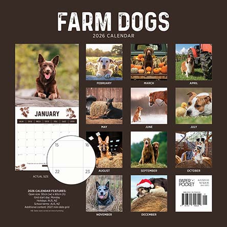 Cheer on these courageous canines as they put in the hard yards on the farm, in this 2026 Farm dogs calendar.