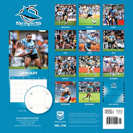 The official NRL Cronulla Sharks Club 2026 wall calendar featuring all your favourite club players in action on the field.