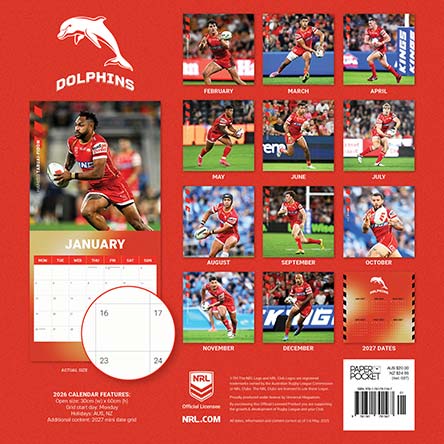 The official NRL Dolphins Club 2026 wall calendar featuring all your favourite club players in action on the field.