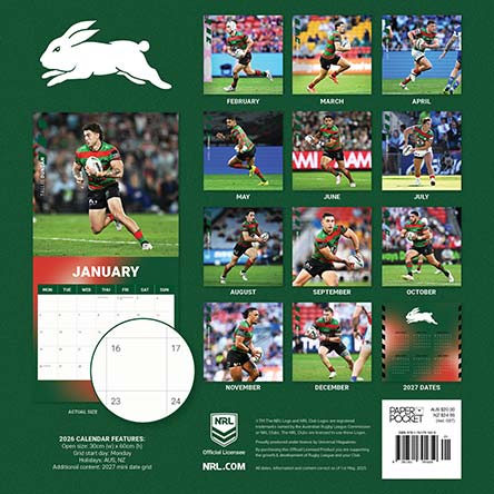 The official NRL South Sydney Rabbitohs Club 2026 wall calendar featuring all your favourite club players in action on the field.