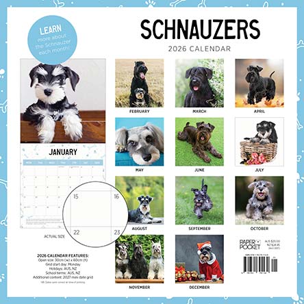 Enjoy a new and adorable Schnauzer photo every month with this 2026 Schnauzer wall calendar