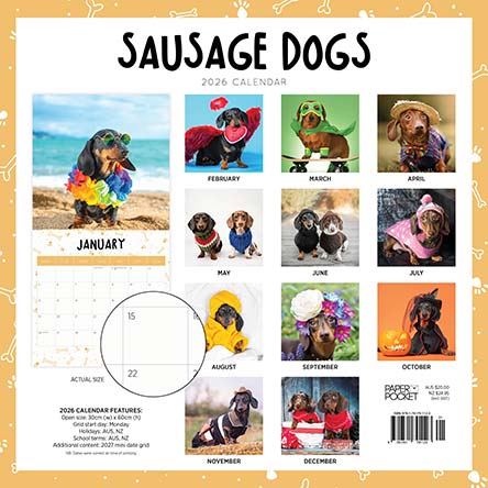 See these little dachshund (Sausage dogs) every month, inside this 2026 wall calendar
